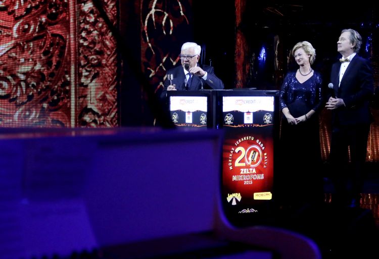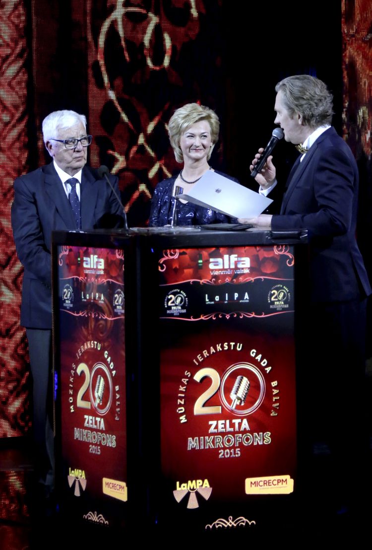 First Lady Iveta Vējone presents an award “Diamond Microphone” to Raimonds Pauls at the awarding ceremony of Music Record Awards “Golden Microphone”