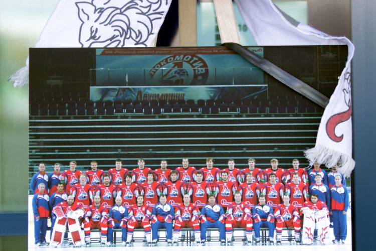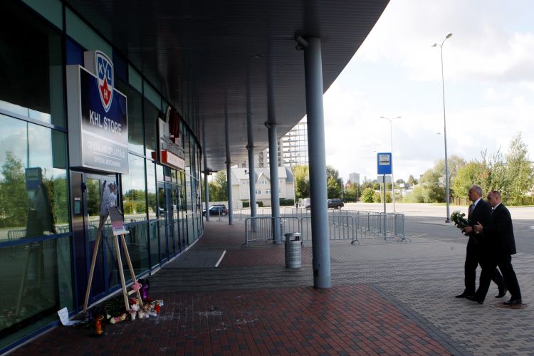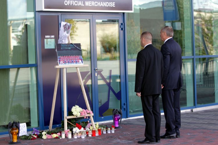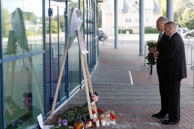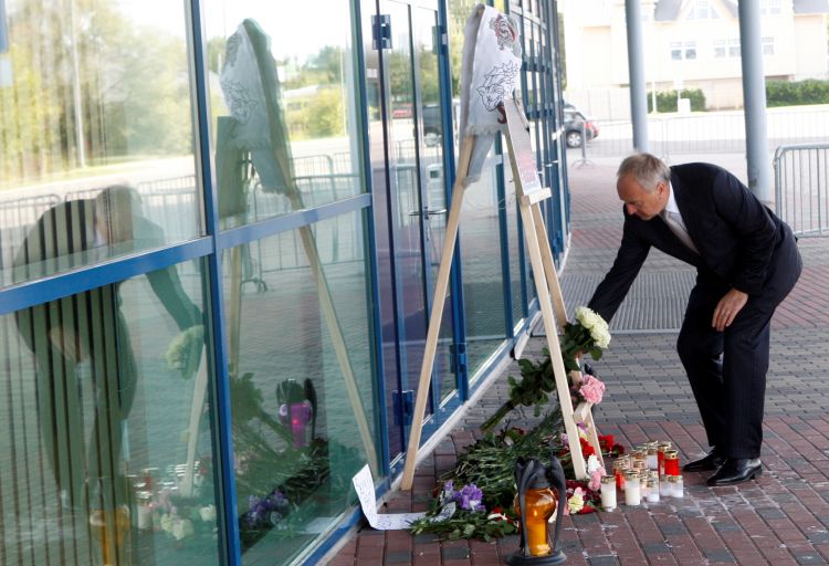 President Andris Bērziņš lays down flowers and candle in honour of the Latvian ice hockey player Kārlis Skrastiņš after his tragic death