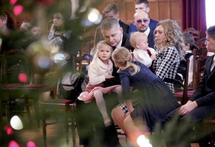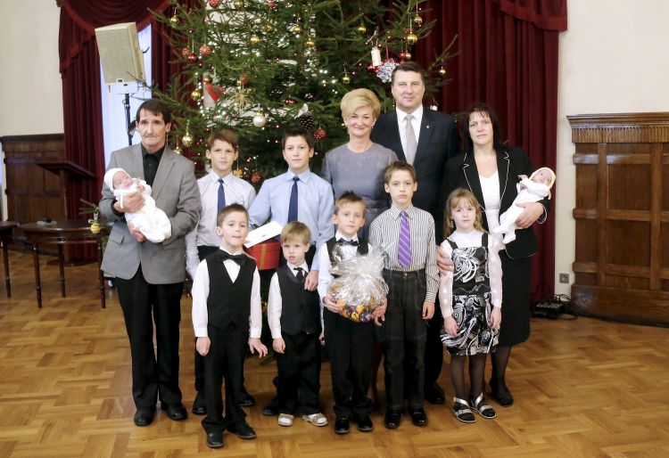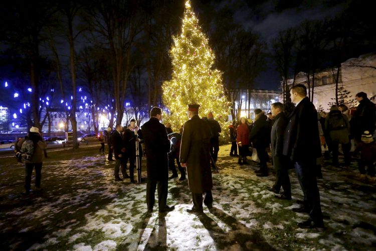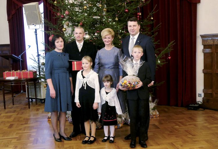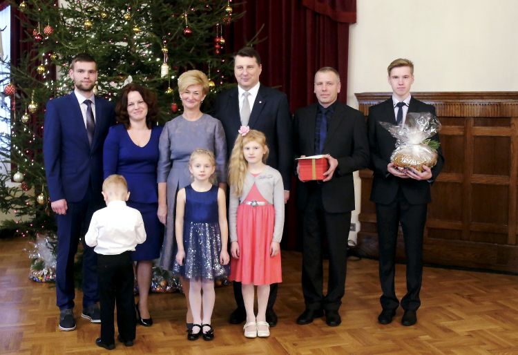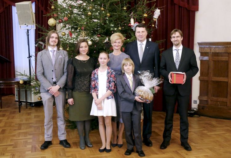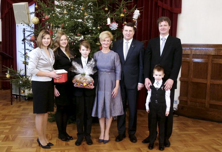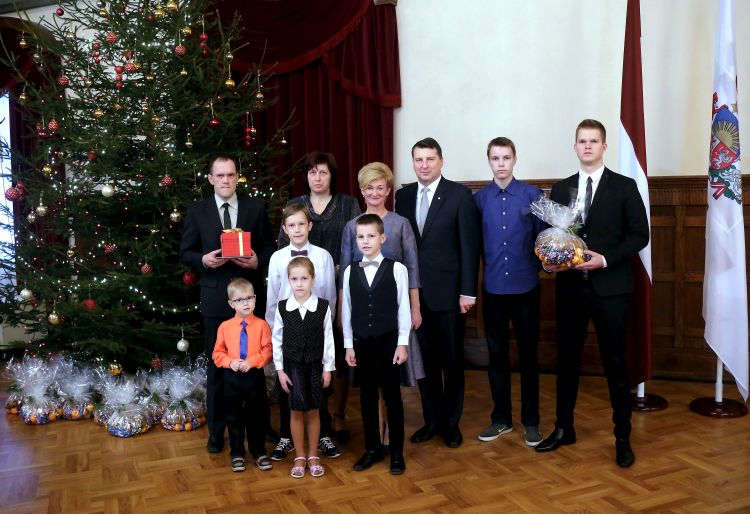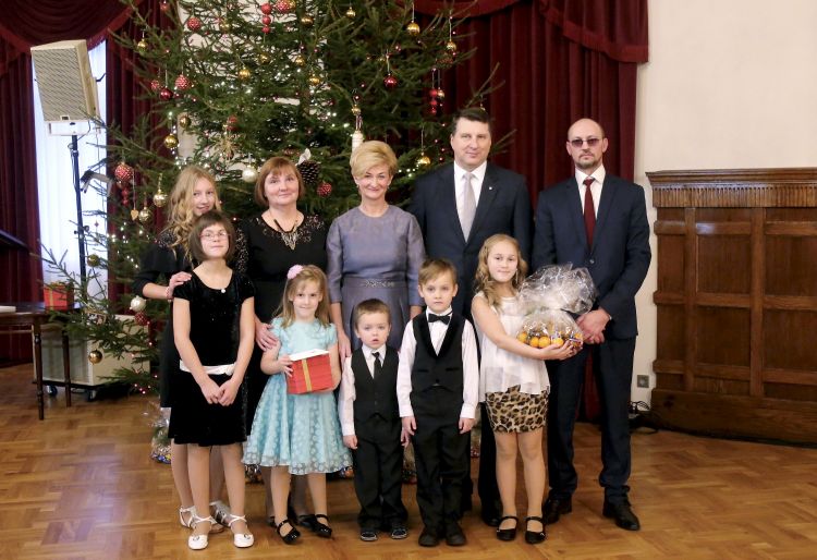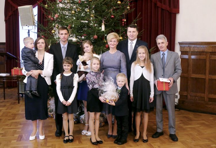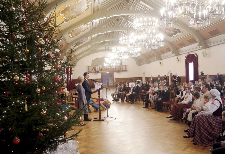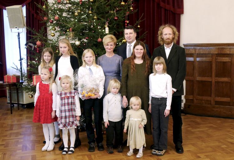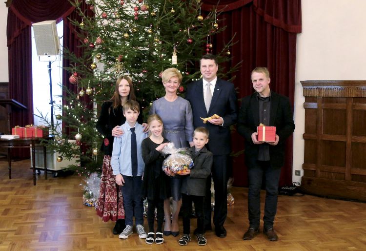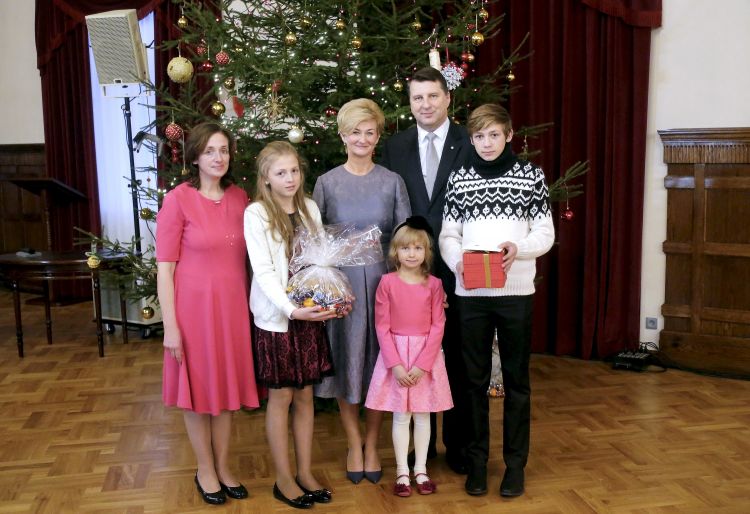 The President of Latvia and First Lady of Latvia Iveta Vējone participate in the ceremonial lighting up of the Christmas tree of the Riga Castle with Latvian families