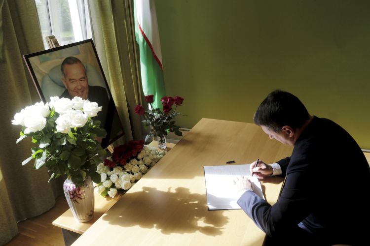 President of Latvia Raimonds Vējonis signs in the book of condolescences of the Embassy of Uzbekistan on the death of President of Uzbekistan Islam Karimov