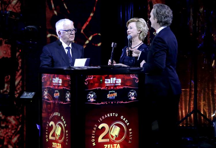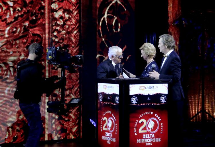 Iveta Vējones kundze pasniedz balvu “Dimanta mikrofons” Raimondam Paulam Mūzikas ierakstu gada balvas “Zelta Mikrofons” apbalvošanas ceremonijā